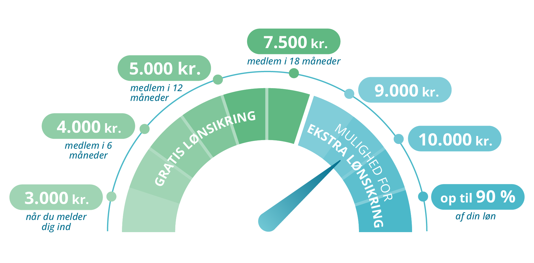 Vi giver dig som sagt en gratis lønsikring op til 7.500 kr./md., hvis du er medlem af Fries a-kasse og fagforening til 672 kr. pr. måned og opfylder betingelserne. Den sikrer dig et højere beløb oveni dagpengene ved ufrivillig ledighed.